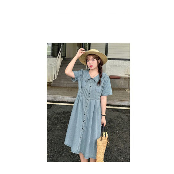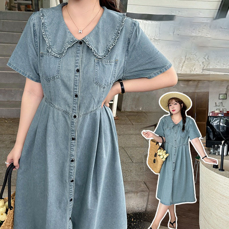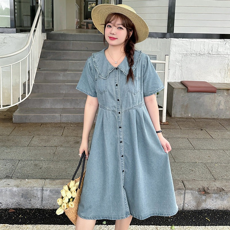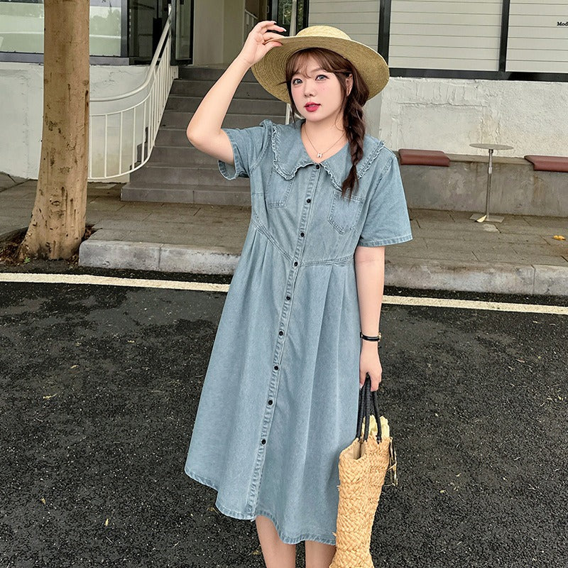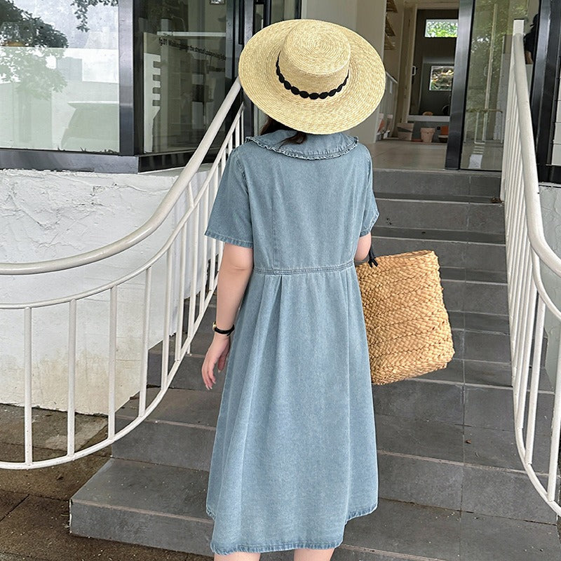 Retro Summer Doll Collar Denim Dress Women High-Waist A-line Skirt