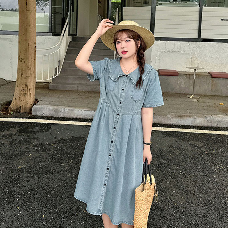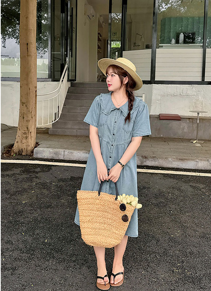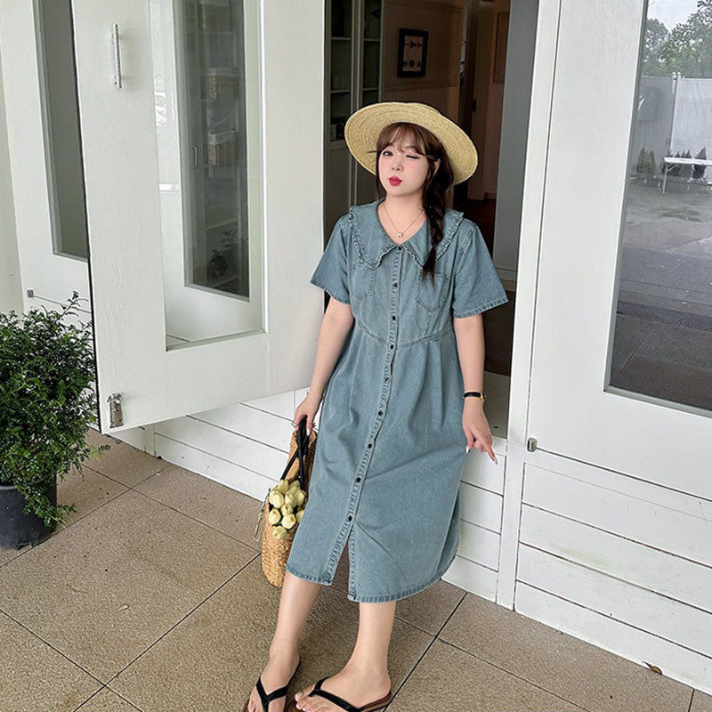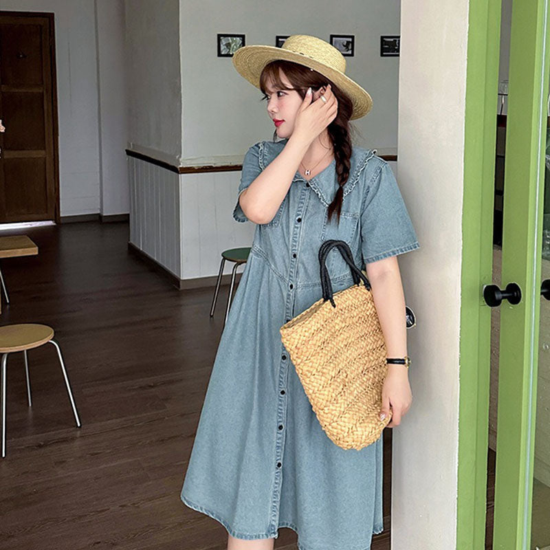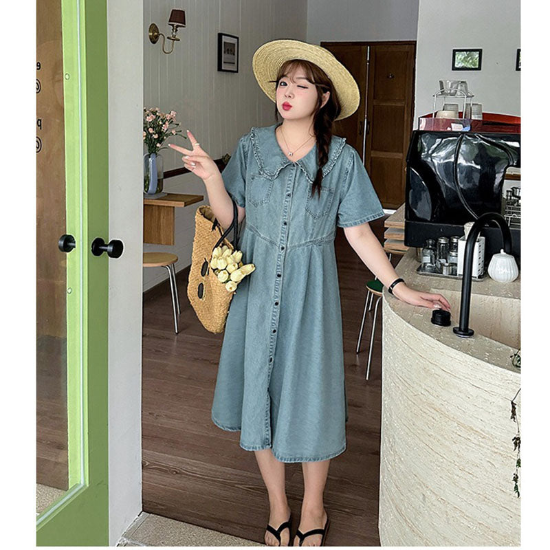 Retro Summer Doll Collar Denim Dress Women High-Waist A-line Skirt